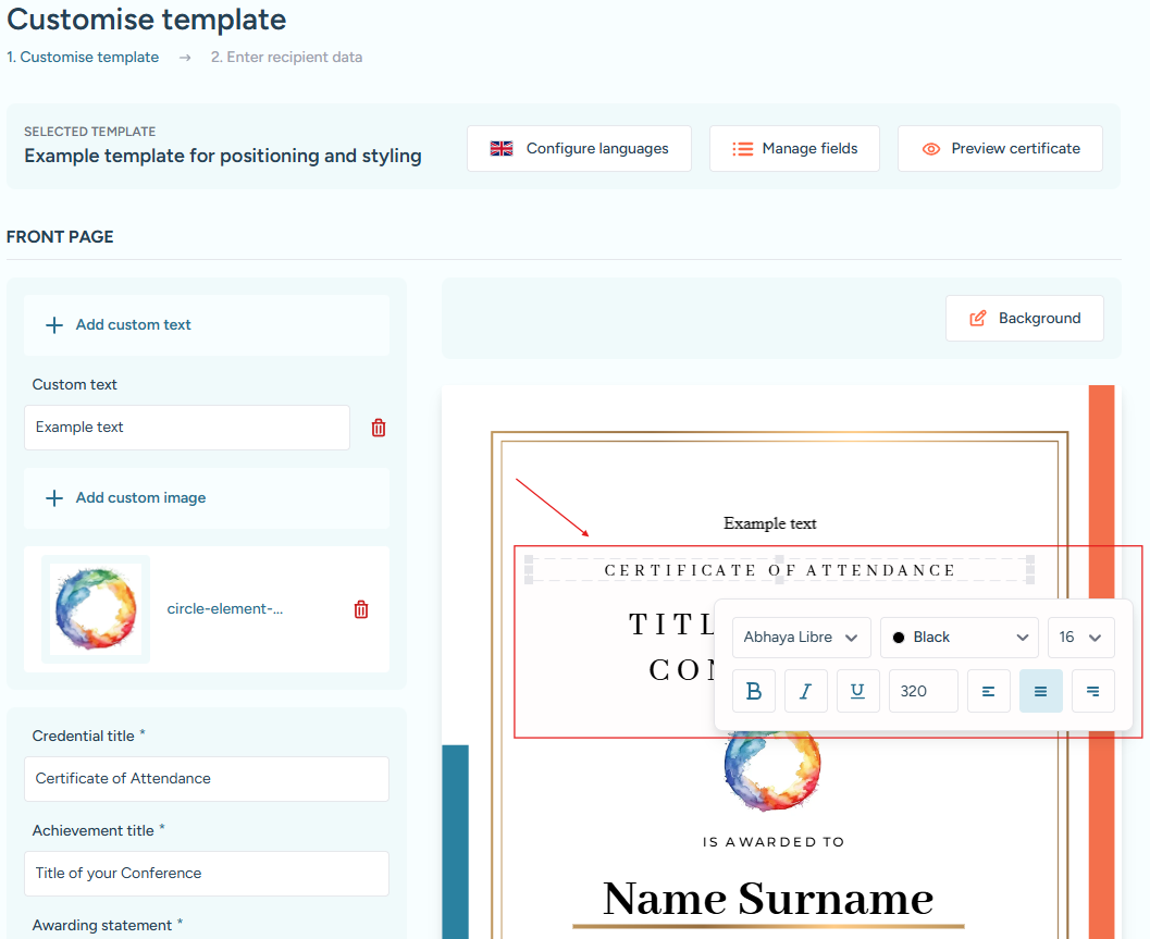 Text styling options become available by double-clicking a text element in the preview. The customisation modal provides controls for font family, font size, colour, text alignment, and bold formatting. These settings make it possible to establish visual hierarchy and consistency across the credential design.