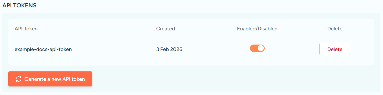 Once created, the API token will appear in the API Tokens list. From this section, you can manage your tokens at any time. Tokens can be enabled or disabled as needed, or permanently deleted if they are no longer in use.